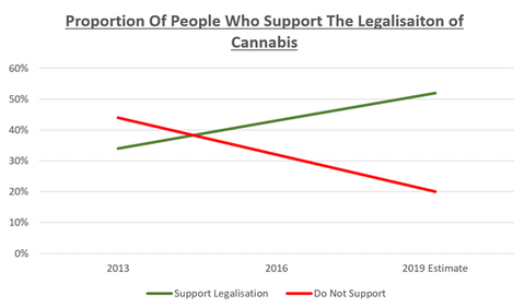 Support for cannabis legalisation is on an upward trend while the opposition for the idea continues to decrease. Source: Cannabisexpress
